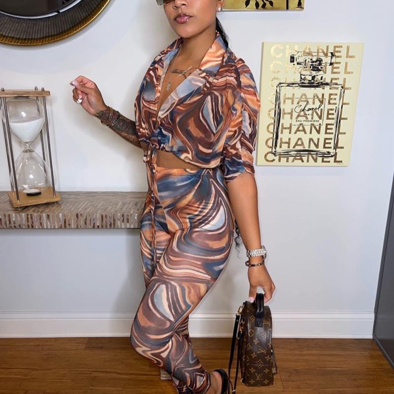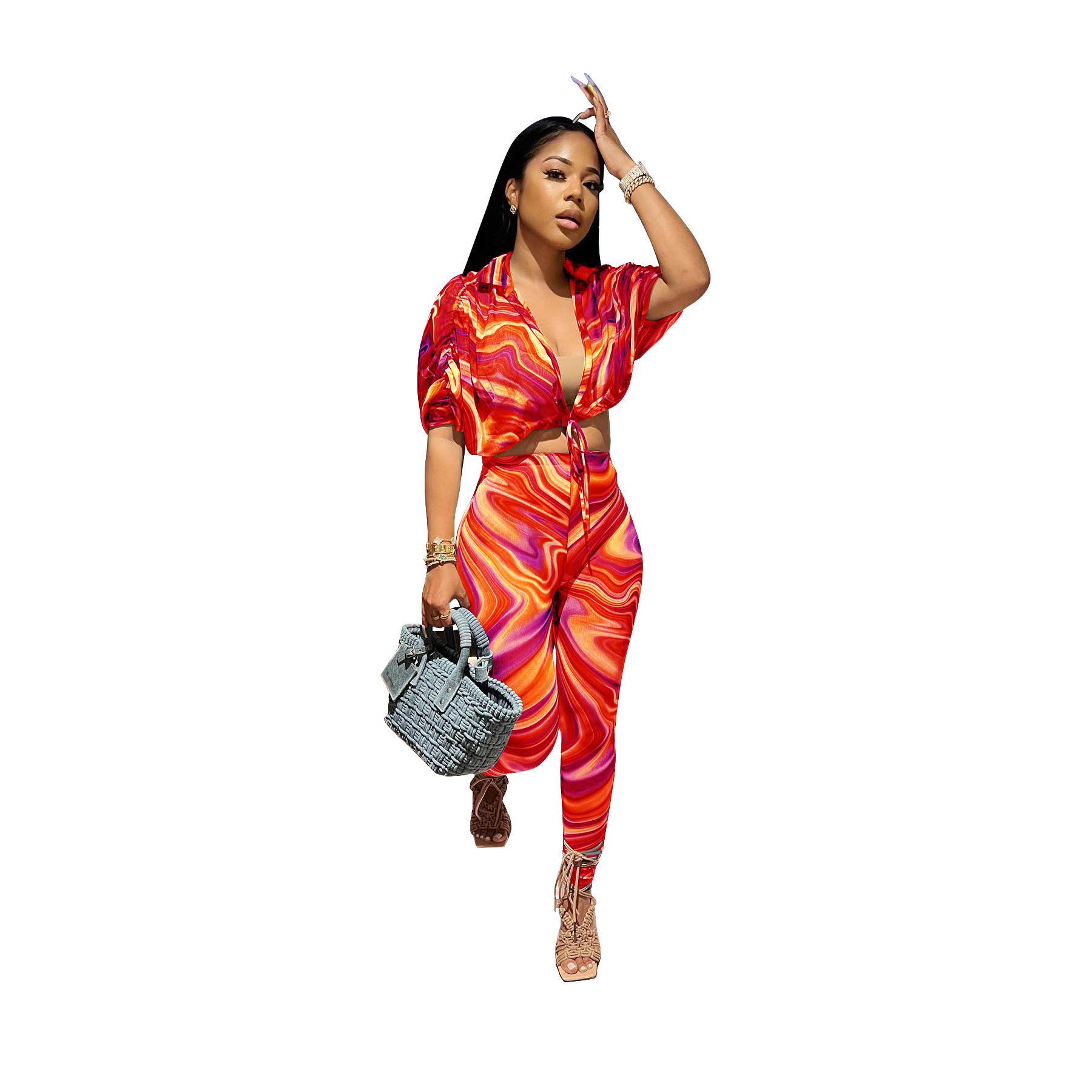 Conjunto informal de dos piezas con blusa y pantalón de manga corta con estampado ondulado sencillo para mujer