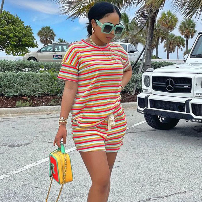 Conjunto deportivo informal de manga corta con estampado de rayas para mujer