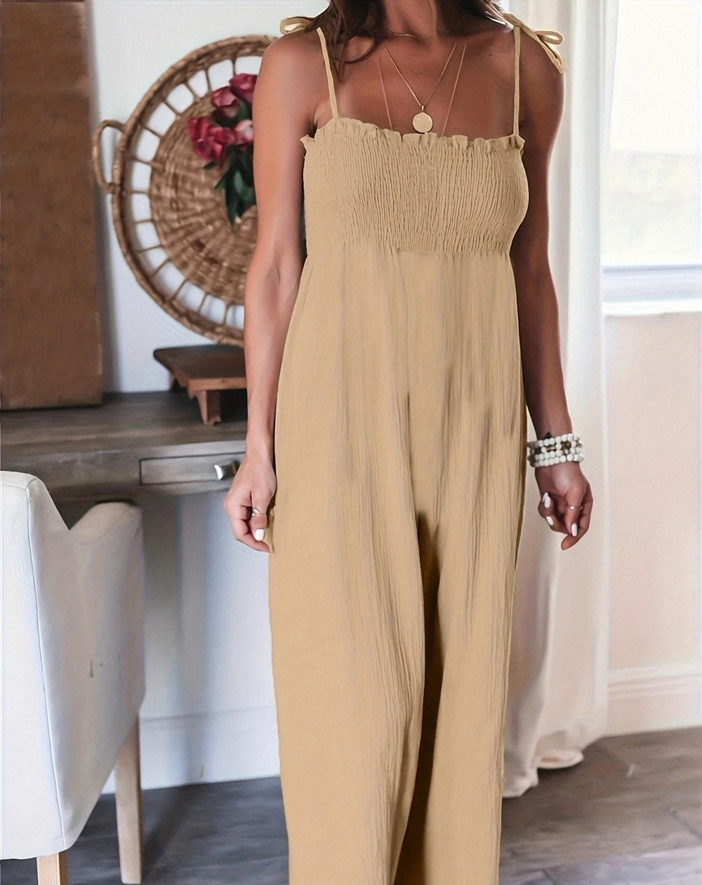 Experimenta la alegría de un estilo sencillo y un ajuste perfecto con nuestro mono ahumado de pierna ancha y relajado para mujer. Ideal para días informales, este mono ofrece un ajuste relajado que te permite moverte con libertad y lucir elegante sin esfuerzo. Su tejido ligero y su diseño de pierna ancha te garantizan una sensación de bienestar, convirtiéndolo en una prenda indispensable para tu armario de primavera y verano. Con su diseño versátil, nuestro mono se adapta a la perfección tanto a un brunch soleado como a una salida nocturna, asegurándote un aspecto impecable en cualquier ocasión. La manga con cordón le da un toque único, permitiéndote ajustar tu look y siendo fácil de llevar. Descubre tu belleza natural y disfruta de cada momento con un mono que combina moda y funcionalidad.