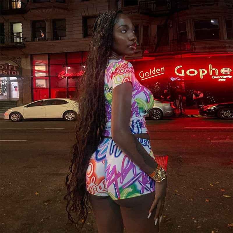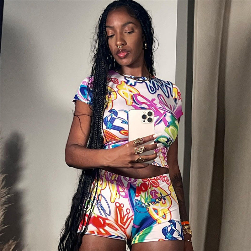 Conjunto informal de camiseta de manga corta con estampado gráfico y pantalones cortos ajustados de cintura alta para mujer, moda de verano y primavera
