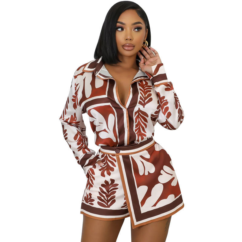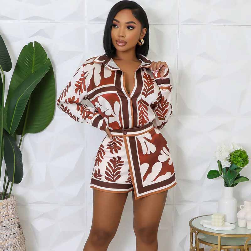 Conjunto de dos piezas para mujer, de manga larga, informal, a la moda, con estampado de hojas, camisa y pantalones cortos, para verano