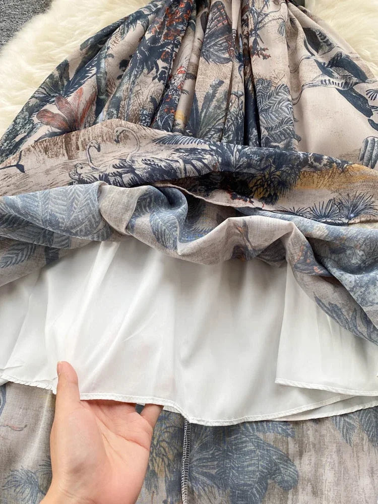 Women Vintage Party Dress Summer French Elegant Print Dress Ladies High Waist Retro Single Breasted Belt Casual Long Dress