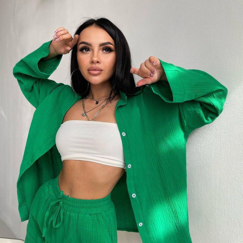 Conjunto de dos piezas de camisa y pantalones cortos de manga larga de color liso informal para mujer