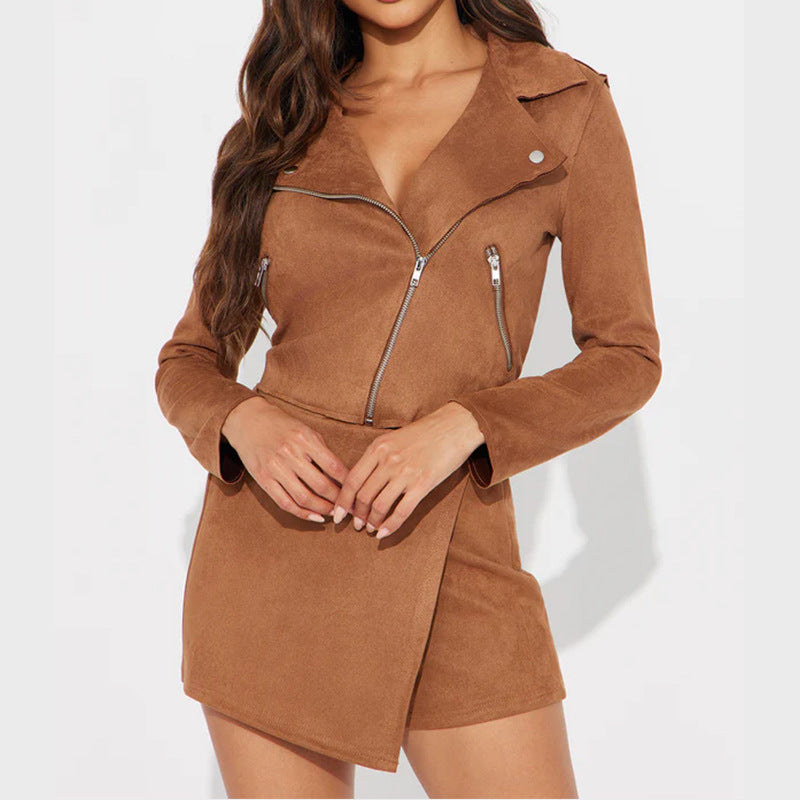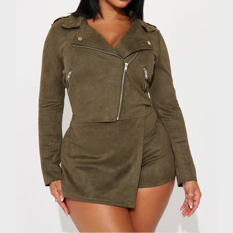 Autumn Women Fashion Casual Long Sleeve Side Zipper Coat Top High Waist Skirt Two-Piece Set