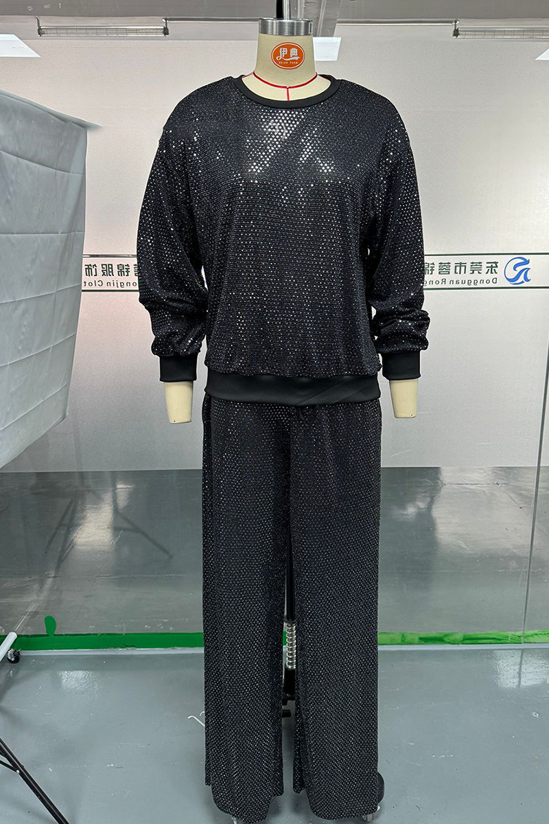 Casual Draw String Pocket Sequined O Neck Long Sleeve Two Pieces