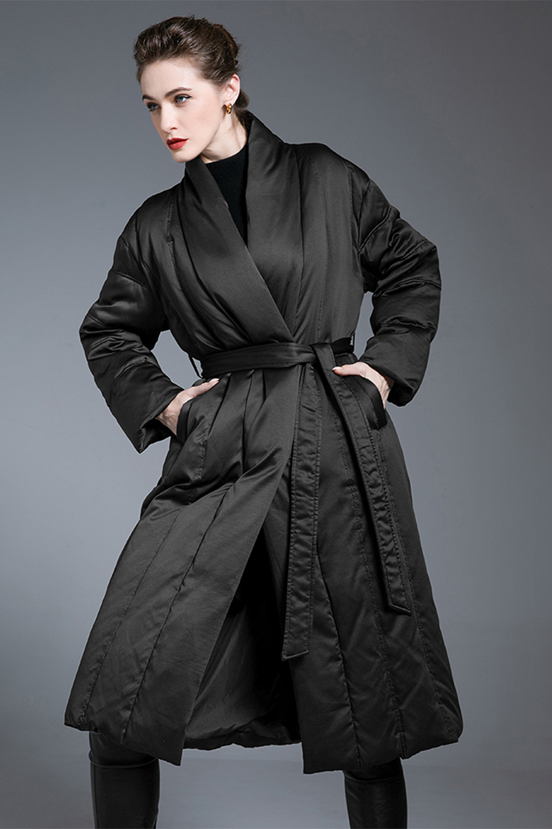 This is a long lace up waist slimming and thick down jacket. Knee over warm and loose commuting style. White duck down filling, with a down content of 91% to 95%, and a down weight of 301-350 grams. Comfortable and casual with pockets.
