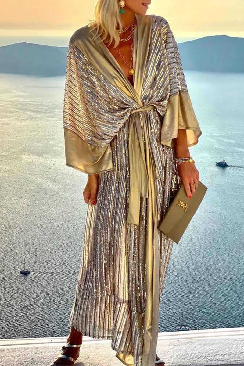Casual Patchwork Sequins V Neck Waist Skirt Dresses(3 Colors)