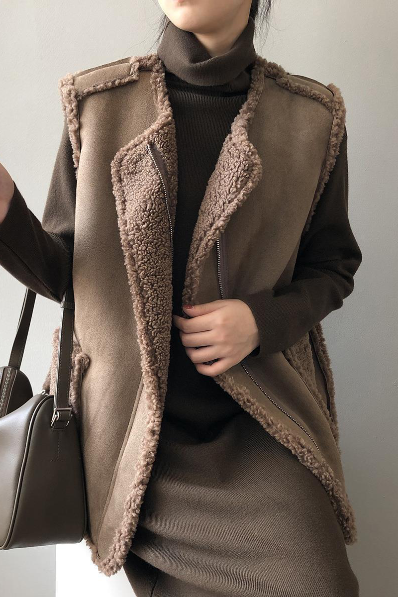 Casual Pocket Patchwork Fluffy O Neck Waistcoats