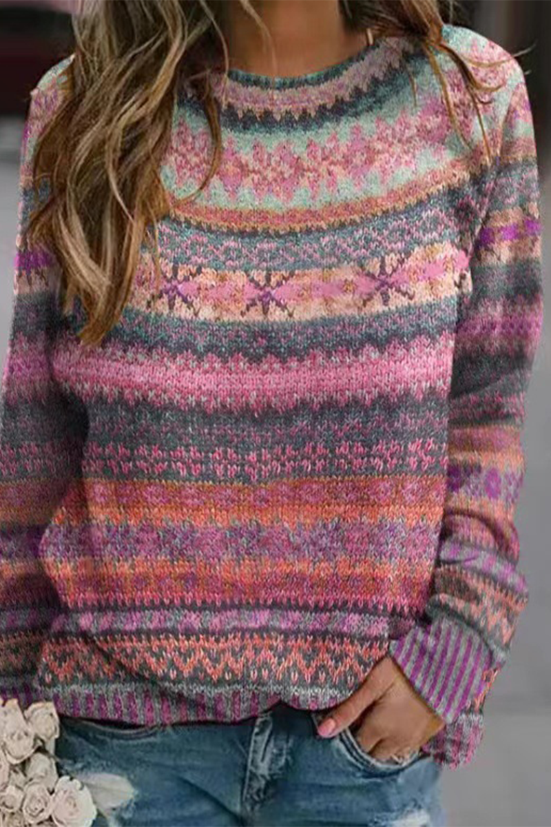 Casual Print Stripe Contrast O Neck Tops(5 Colors)