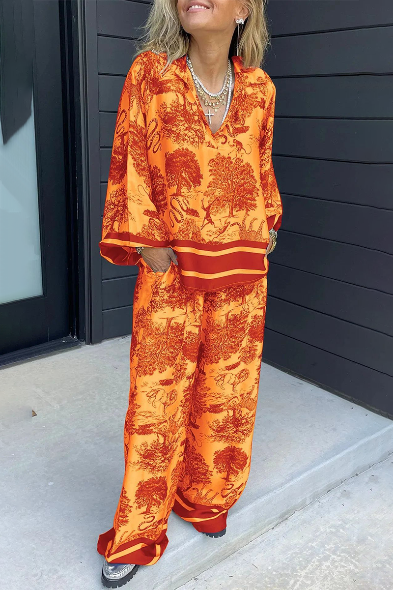 Casual Street Floral Print Distressed Draw String Pocket V Neck Long Sleeve Two Pieces(8 Colors)