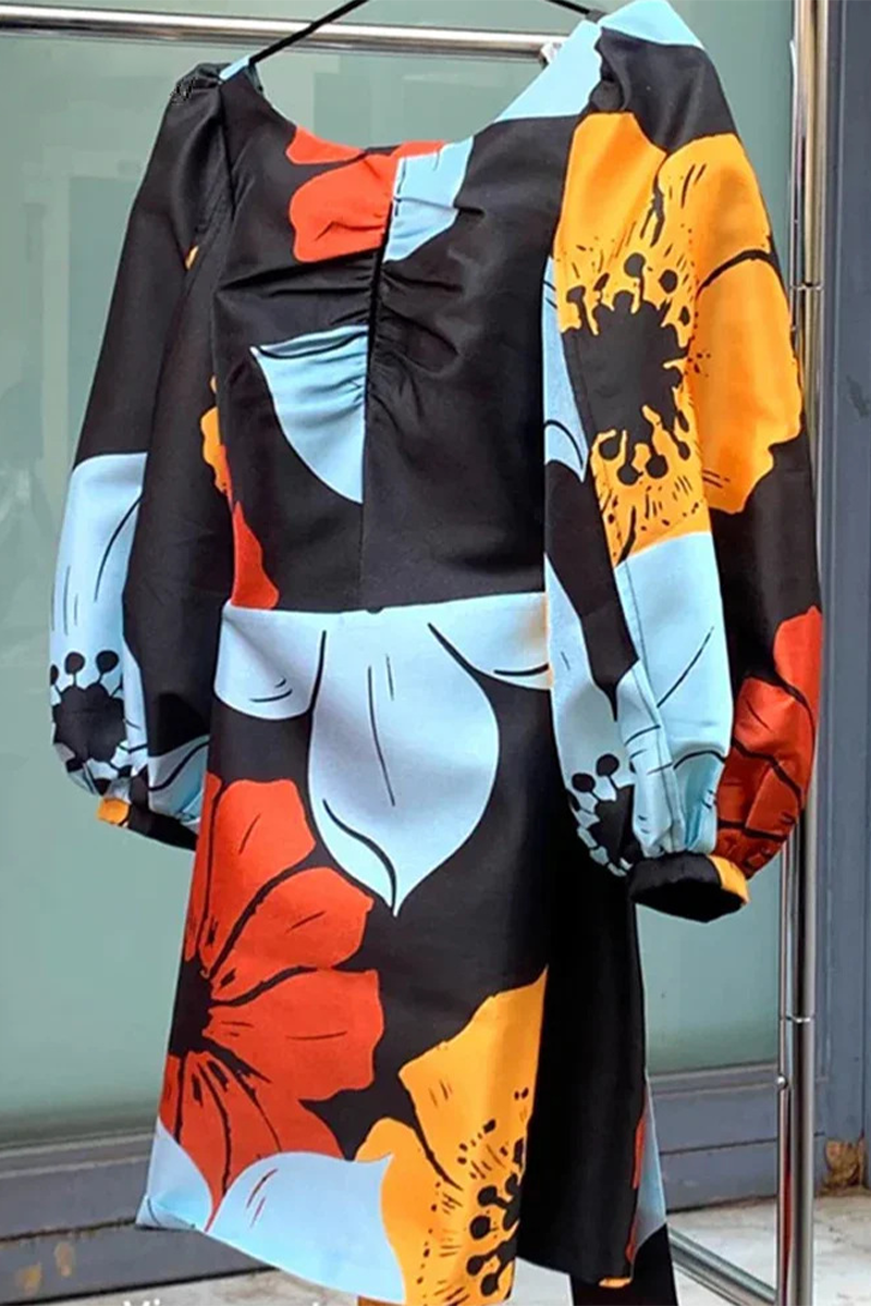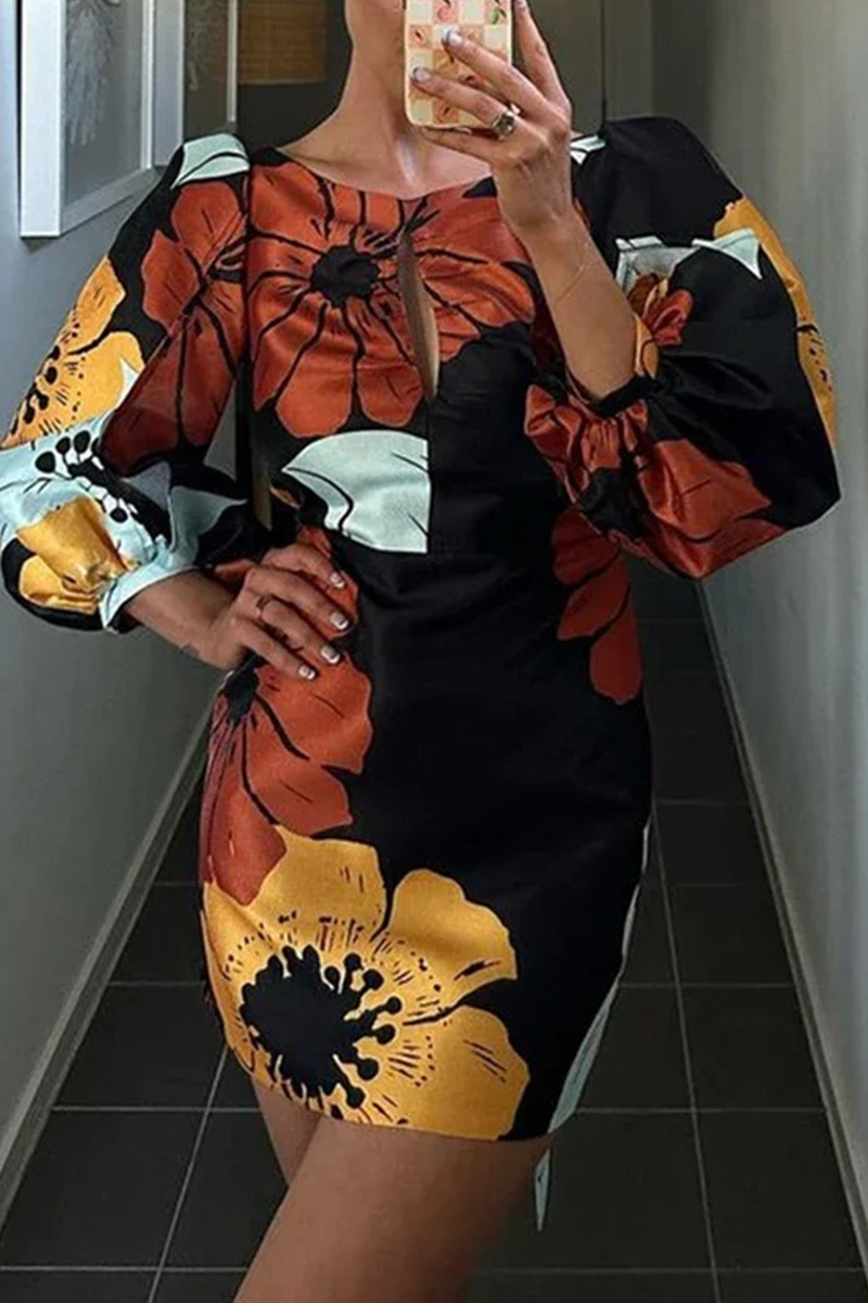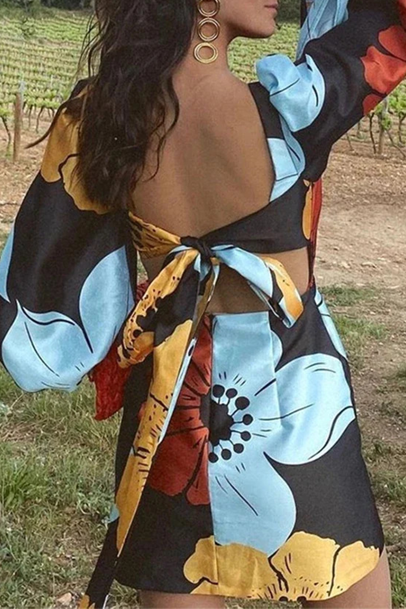 Casual Street Floral Print Lace Up Backless O Neck Wrapped Skirt Dresses