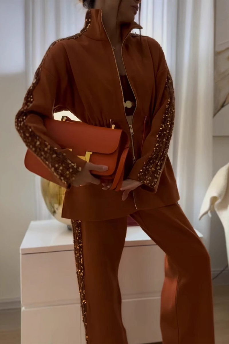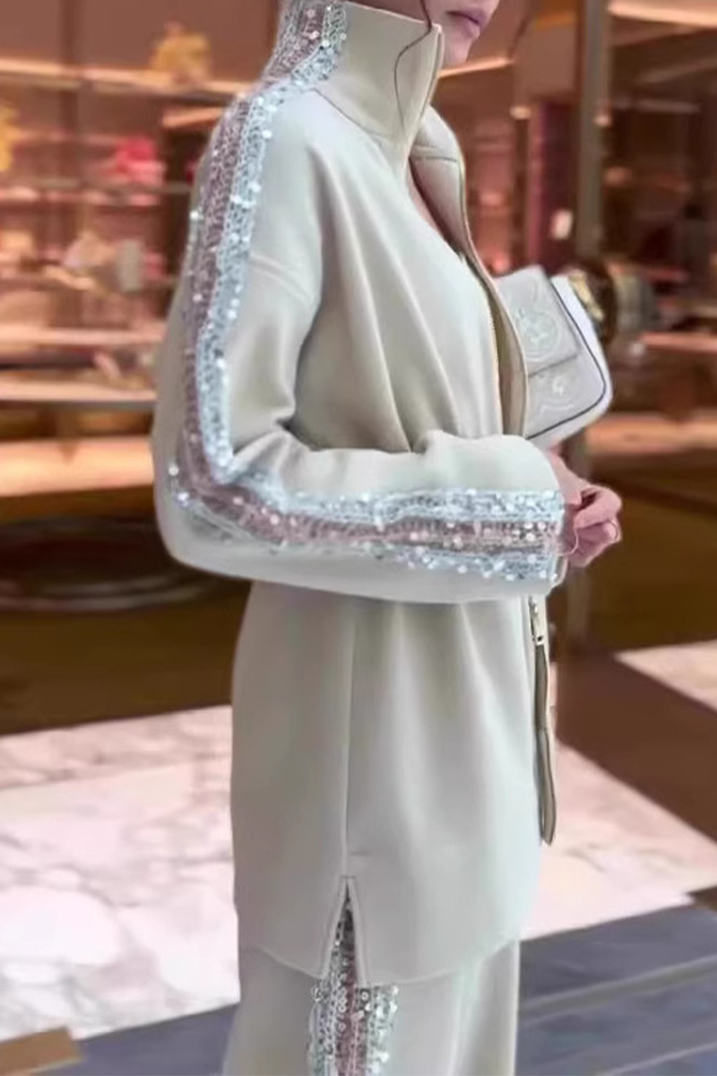 Casual Street Sequins Draw String Patchwork Zipper Mandarin Collar Long Sleeve Two Pieces(5 Colors)