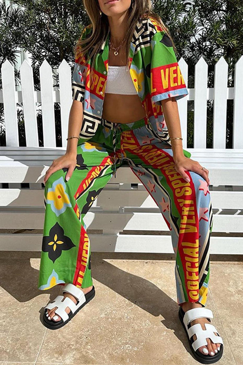 Casual Vintage Print Animal Draw String Turndown Collar Short Sleeve Two Pieces