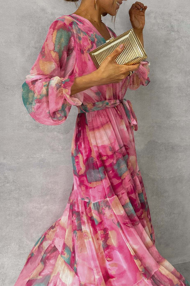 Elegant Gradient Print Lace Up Ruffle V Neck A Line Dresses