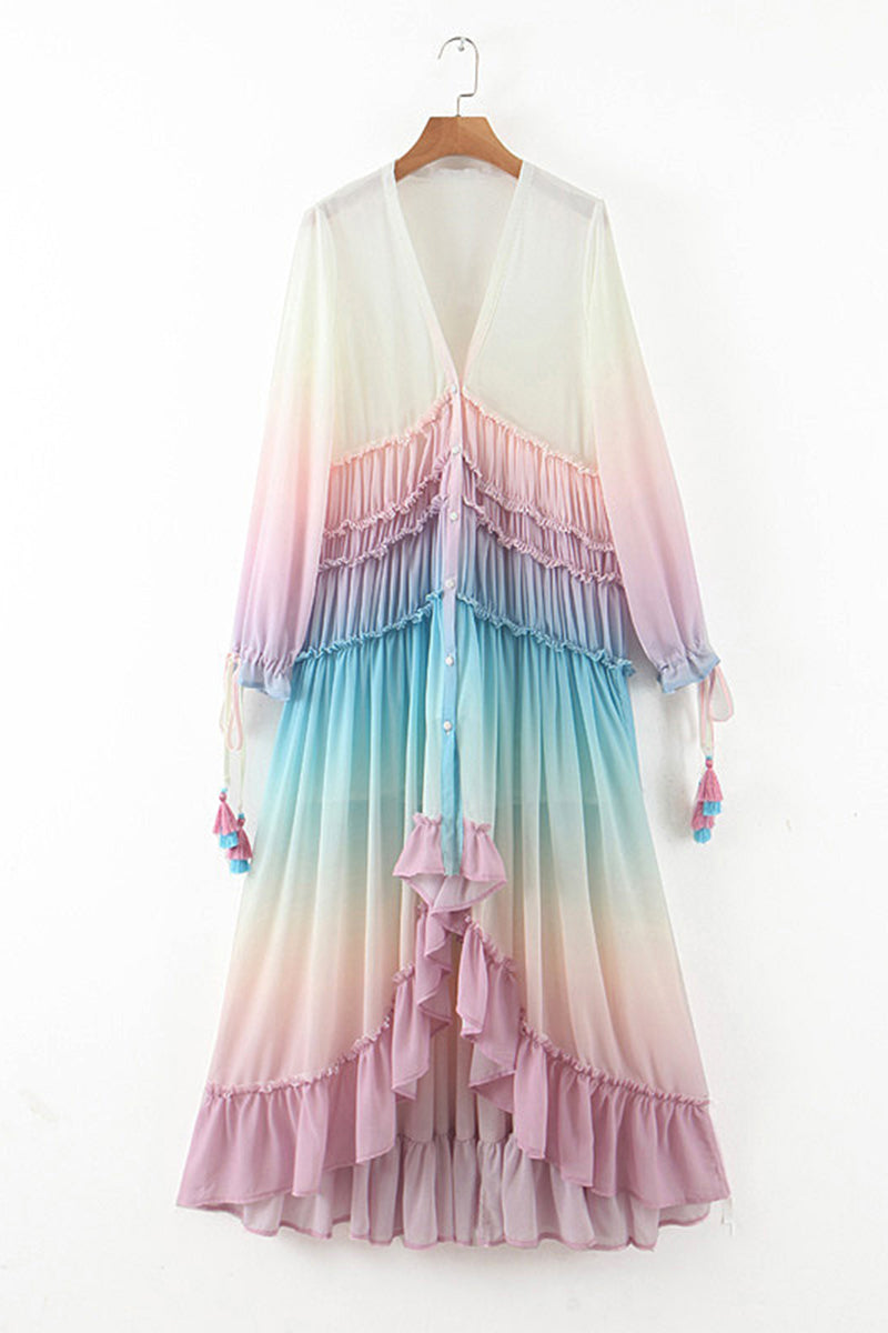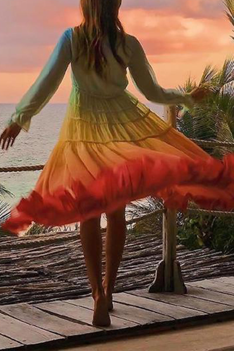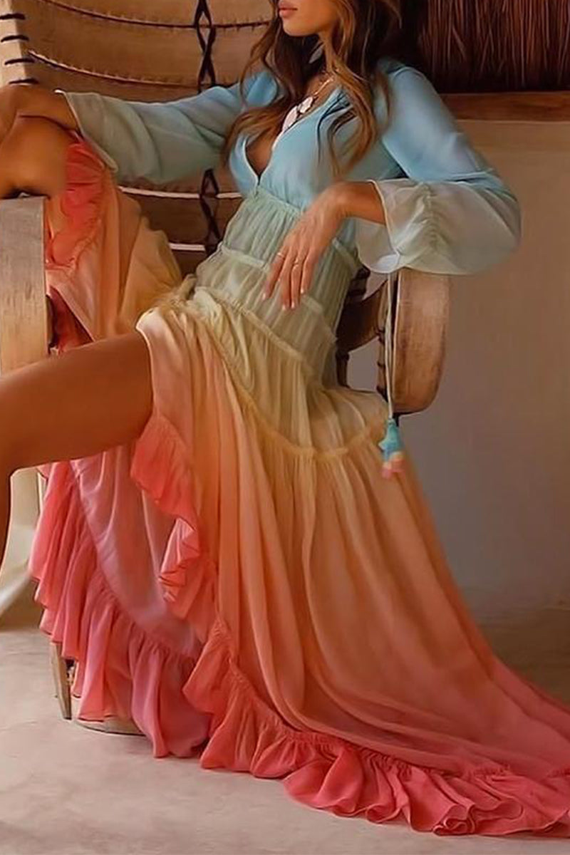Elegant Gradual Change Patchwork Frenulum V Neck Printed Dress Dresses(3 Colors)
