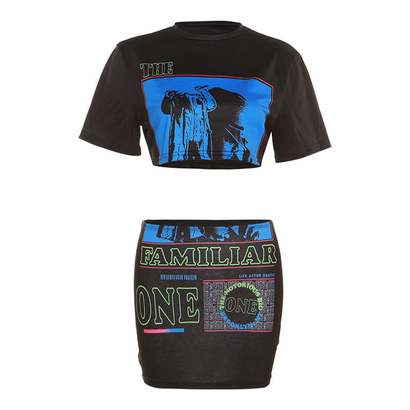 Fashion Women'S Round Neck Casual Letter Print Cropped T-Shirt High Waist Tight Skirt Set