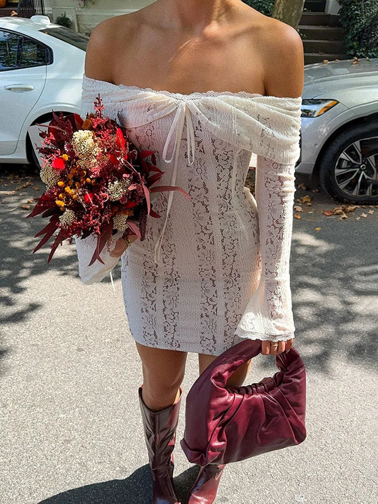 Lace Hollow Slim Mini Dress For Women One Shoulder Sexy Long Sleeves Club Party Dresses Bodycon Bandage Elegant Autumn