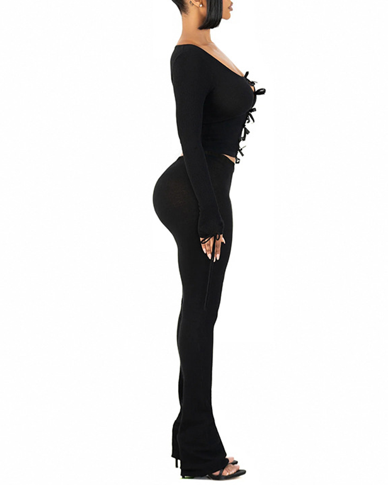 Long Sleeved Bow Tie Tied Hollow Pants Set