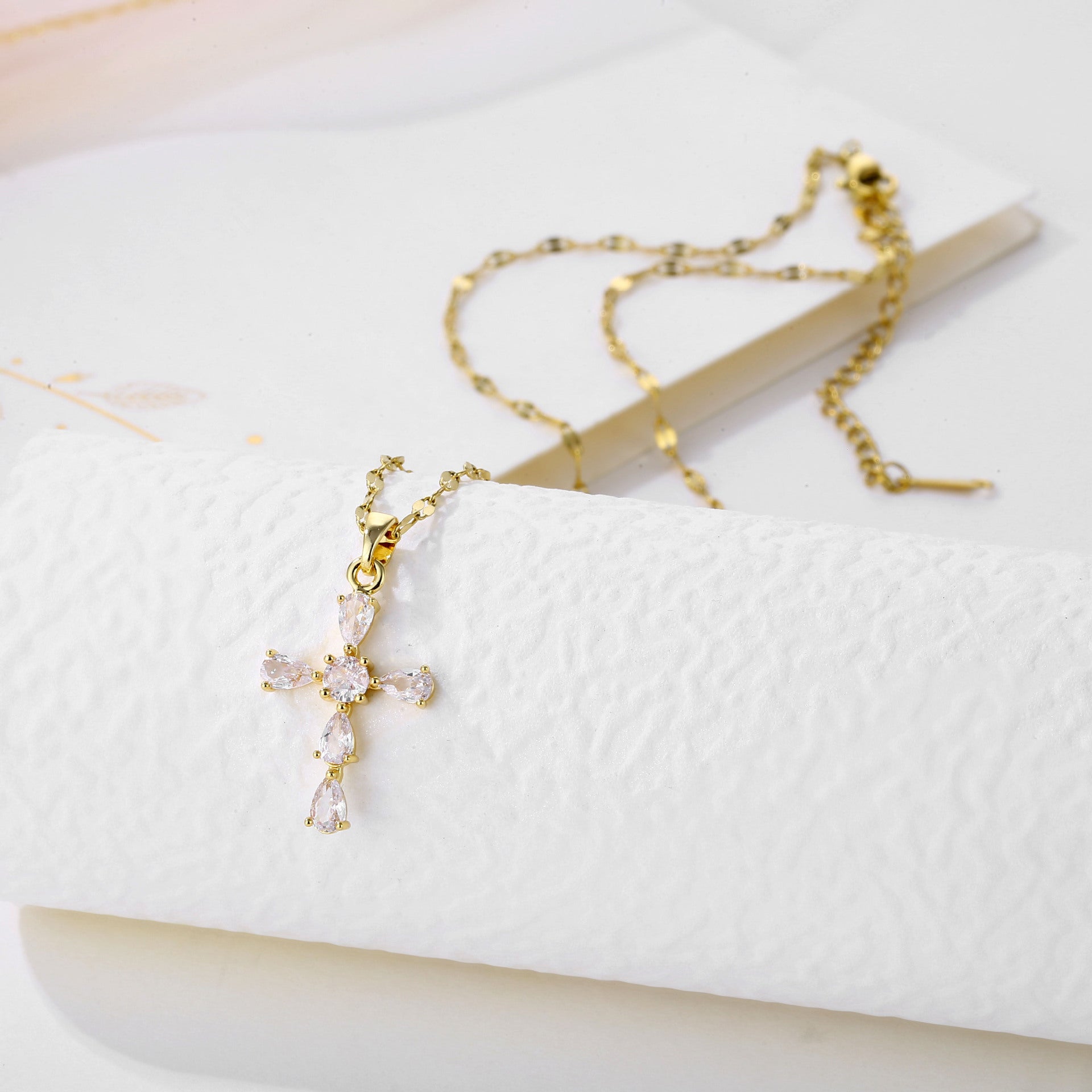 This Radiant Cross Pendant Necklace brings elegance and spirituality together. Made from durable stainless steel and coated in gleaming Gold, the pendant is encrusted with cubic zirconia for a delicate sparkle. The classic cross design, paiRed with a fine chain, adds a touch of timeless beauty to any outfit, making it perfect for everyday wear or special occasions. This necklace is hypoallergenic and tarnish-resistant, ensuring long-lasting shine.