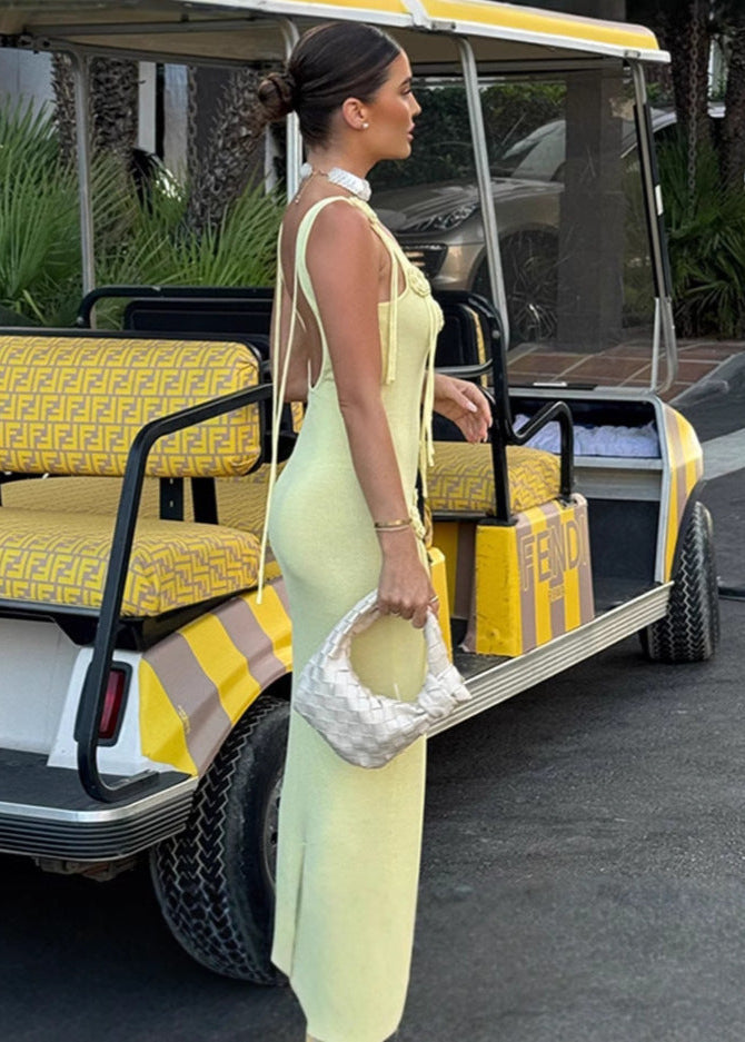 Riviera Bloom - Strappy Knit Midi Dress is an effortlessly chic statement for sun-drenched days. Crafted from a soft, lightweight knit, this midi dress drapes beautifully with a semi-sheer finish, making it the perfect layering piece over swimwear. Delicate 3D floral appliqués and flowing tie details add a playful yet sophisticated touch, while the open-back strappy design enhances its feminine allure. A subtle side slit allows for ease of movement, making this dress ideal for beach getaways, summer soirées, or elevated resort wear.