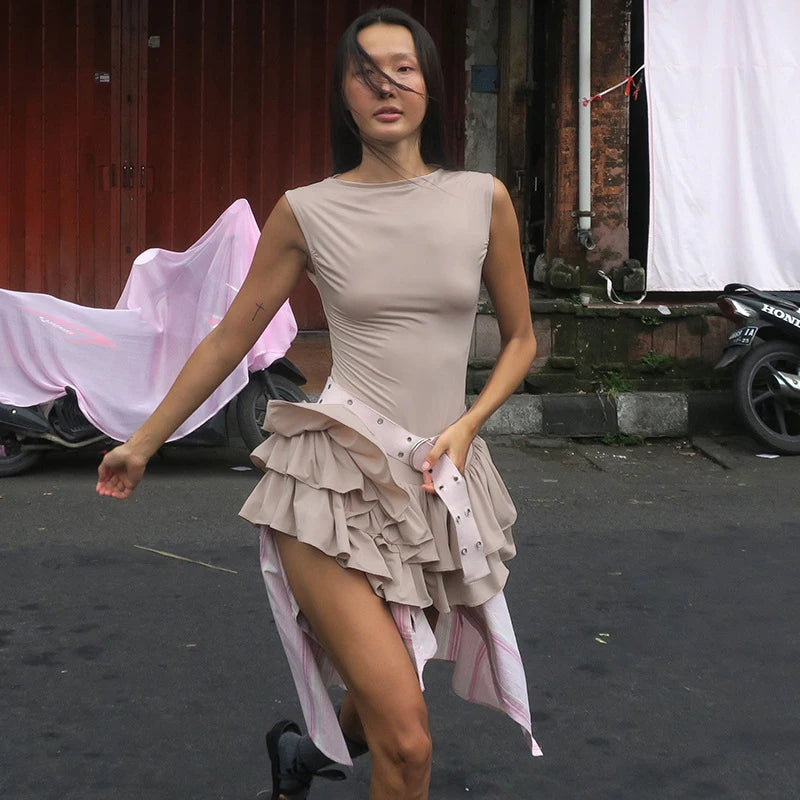 Ruffles Splice Sexy Vest Mini Dress For Women Sleeveless Slim Fit Fashion Solid Color Hot Girl Club Party Dress Female