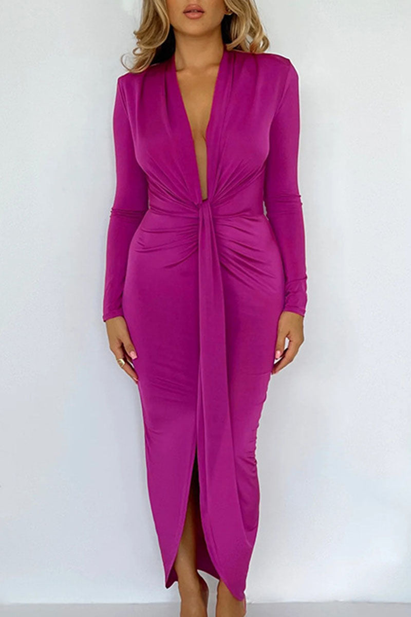 Sexy Solid Patchwork Slit Fold Asymmetrical V Neck One Step Skirt Dresses