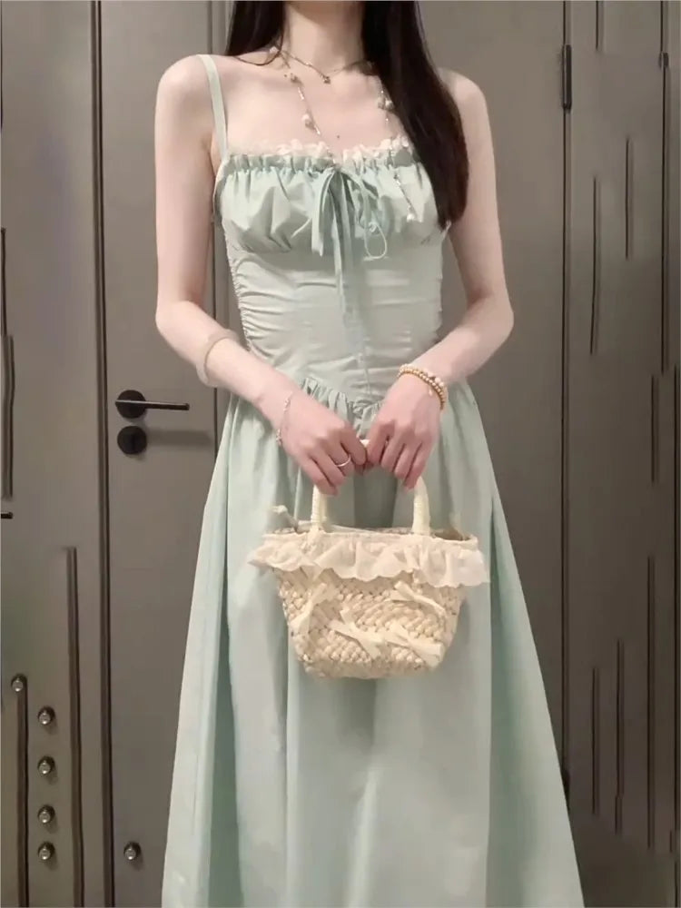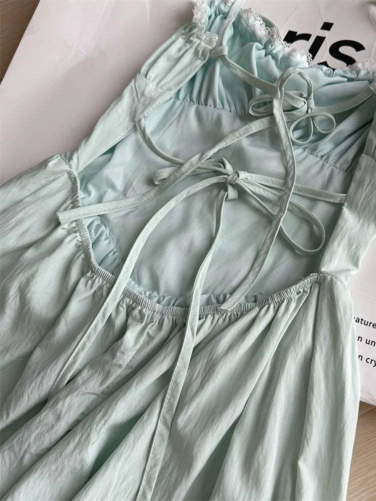 Summer New Spaghetti Strap Backless Midi Dresses for Women Lace-up Sleeveless Beach Style Korean Fashion One Piece Vestido Mujer