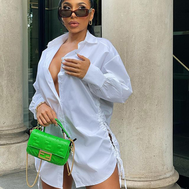 Summer Women Casual Solid Color Hollow Lace-Up Long Sleeve Shirt Dress
