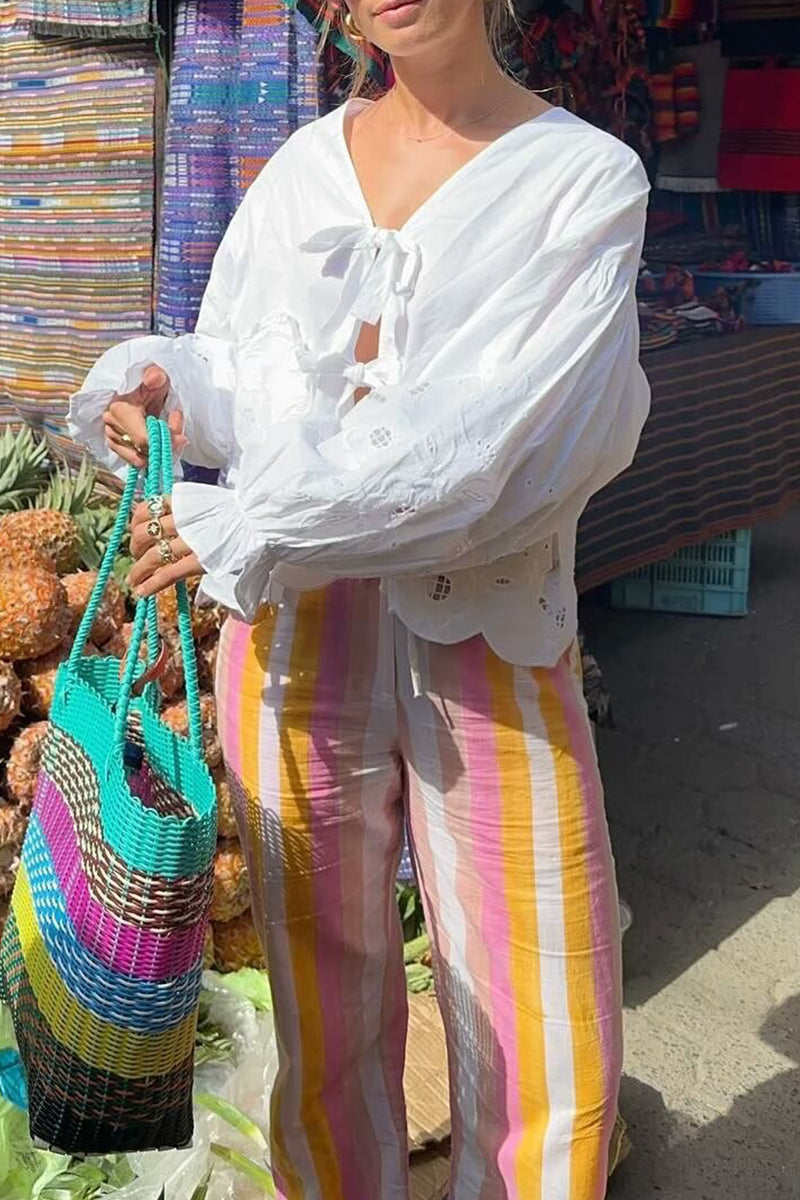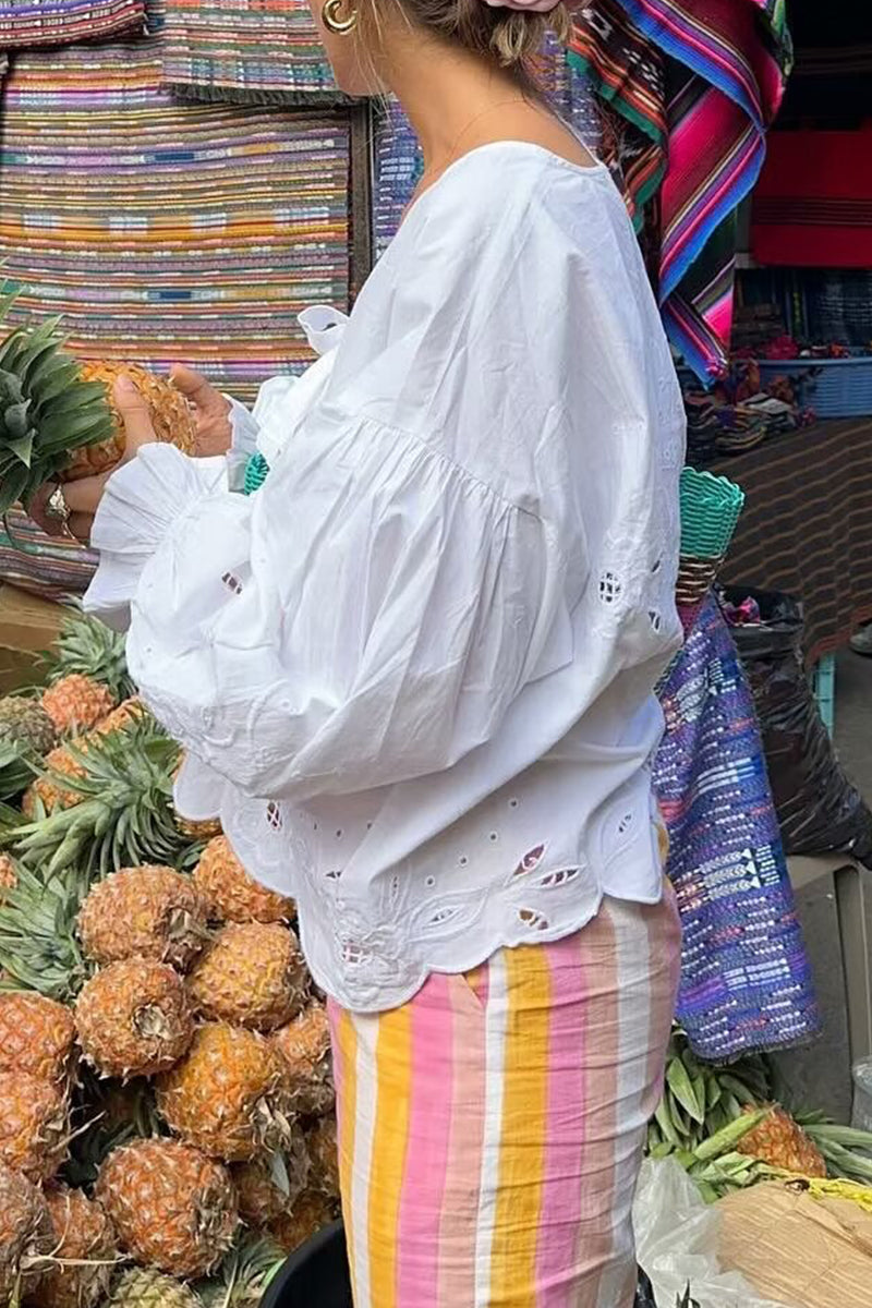 Sweet Solid Embroidered Hollowed Out Frenulum V Neck Tops