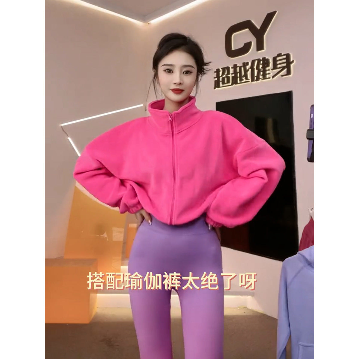 Women Casual Solid Color Fleece-Lined Warm Stand Neck Long-Sleeve Drawstring Sports Top