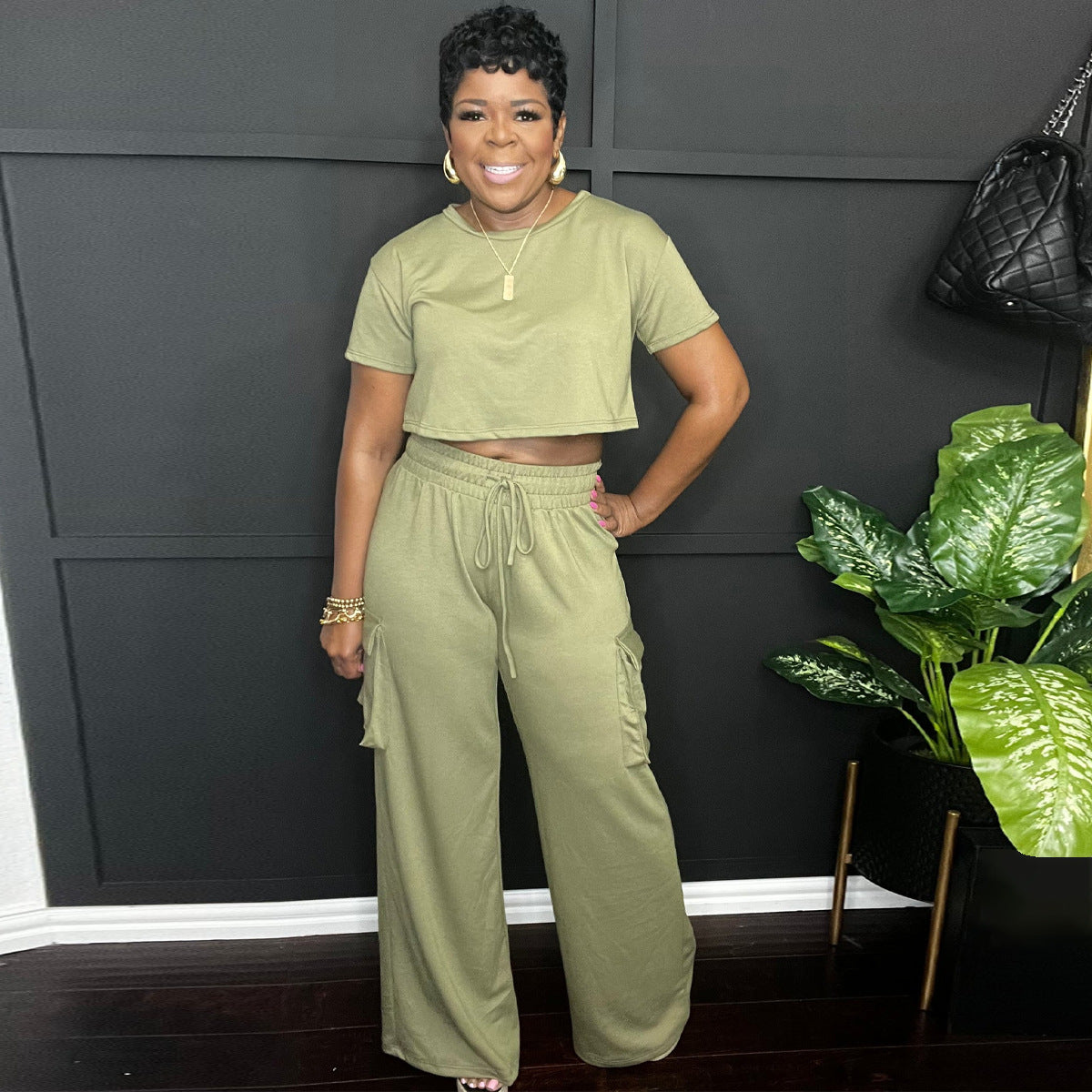Women Casual Solid Color Round Neck Short-Sleeved Crop Top Drawstring Wide-Leg Pants Two-Piece Set