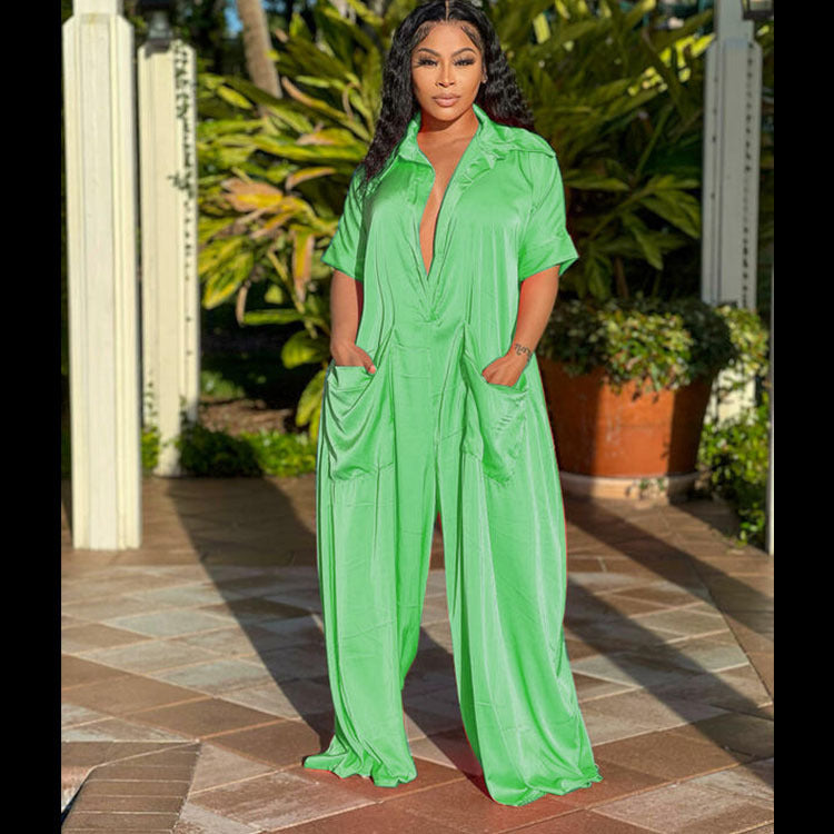 Women Casual Summer Elegant Short Sleeves Fashion Satin Solid Color Loose Jumpsuits