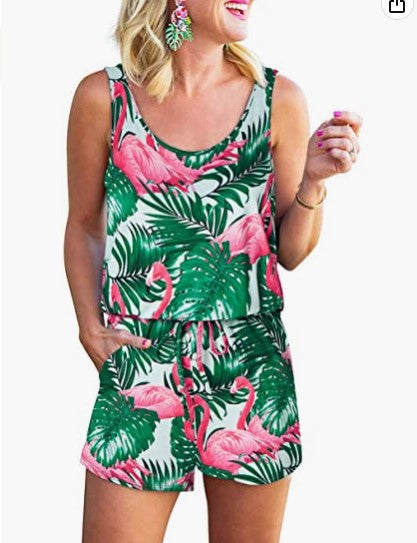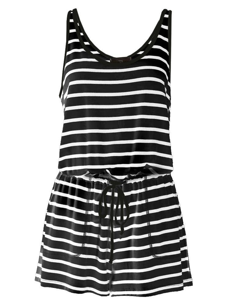 Women Casual Summer Vacation Solid Color U Neck Drawstring Loose Sleeveless Rompers
