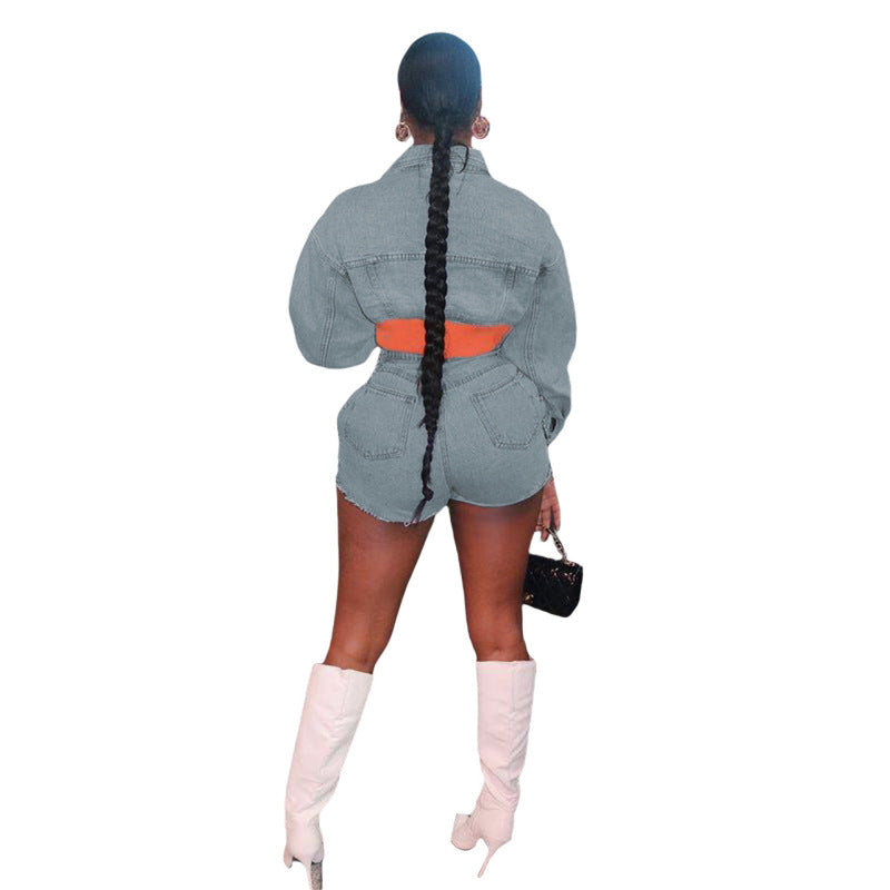 Women Fashion Casual Button Long Sleeve Denim Top Side Cutout Chain Shorts Two-Piece Set