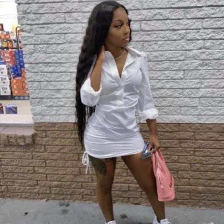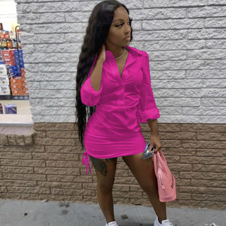 Women Fashion Casual Long Sleeve Solid Color Drawstring Hem Shirt Dress