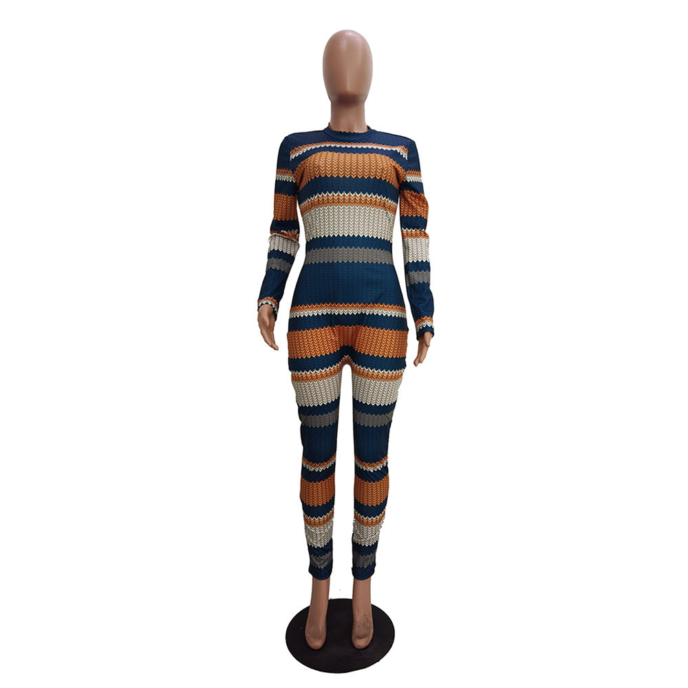 Women Fashion Casual Print Round Neck Long Sleeve Jumpsuit