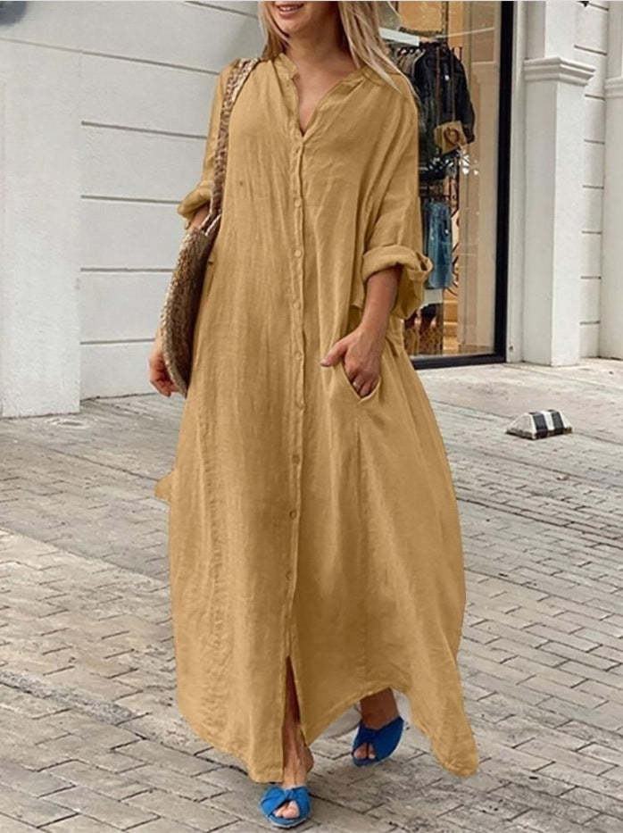 Women Fashion Casual Solid Color Cotton Linen Pocket Shirt Maxi Dress