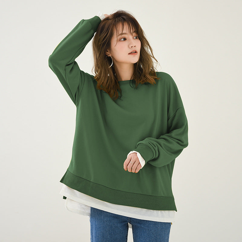Women Fashion Casual Solid Color Fake Two-Piece Long Sleeve Crewneck Sweatshirt