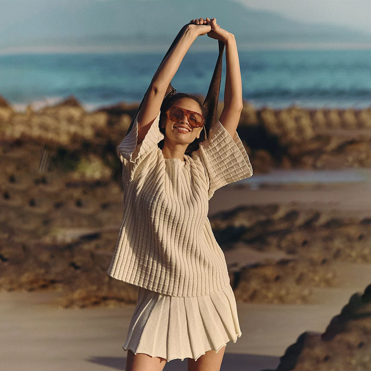 Women Fashion Casual Solid Color Knitted Stripe Long Sleeve Sweater Pleated Skirt Two-Piece Set