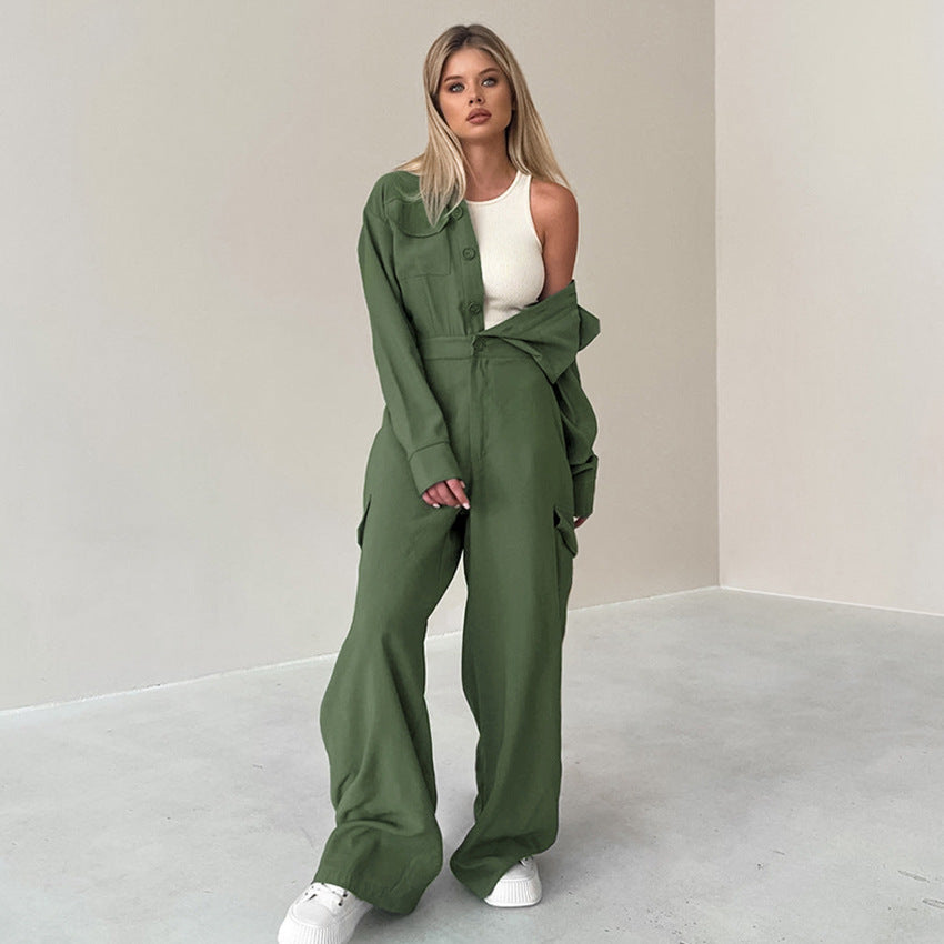 Women Fashion Casual Solid Color Lapel Long Sleeve Cargo Jumpsuits