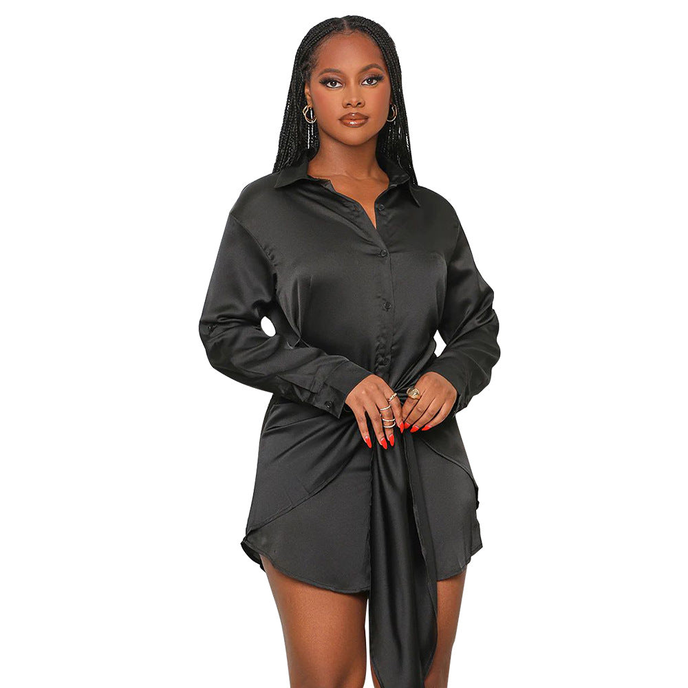 Women Fashion Casual Solid Color Long Sleeve Defined Waist Lapel Shirt Dress