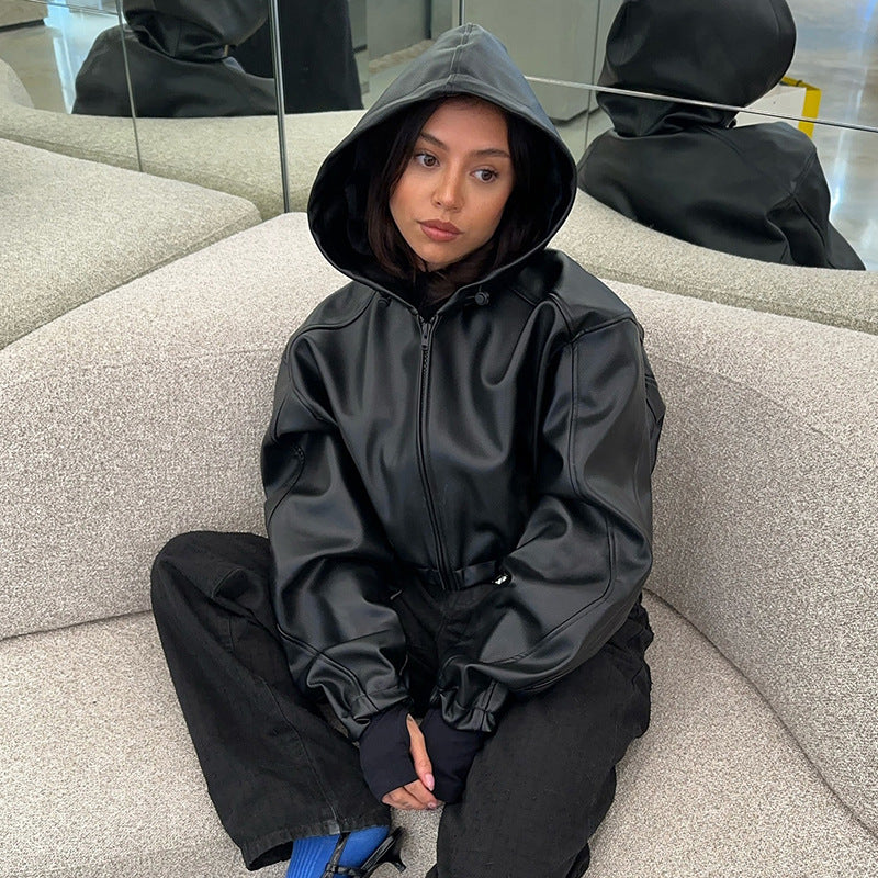 Women Fashion Casual Solid Color Pu Leather Long Sleeve Pleated Zipper Hat Jacket