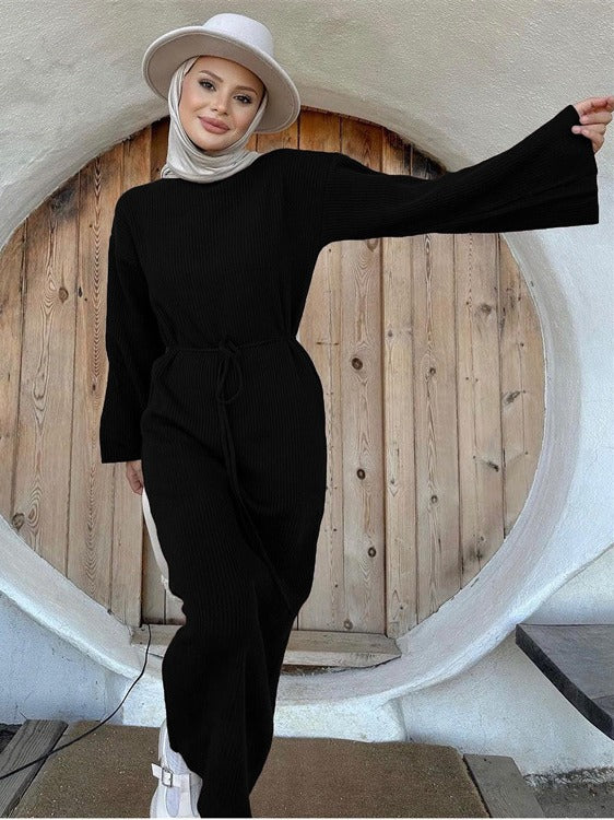 Women Long Sleeve High Waist Strap Autumn And Winter Solid Color Casual Knitted Sweater Dress