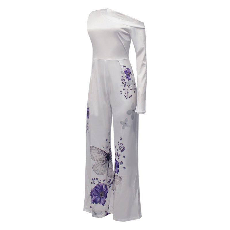 Women Printed Diagonal Neck Long Sleeve Off Shoulder Casual One Piece Wide Leg Jumpsuit