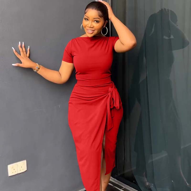 Women Spring And Summer Casual Elegant Solid Color Short Sleeve Top Side-Slit Bowknot Skirt Office Set