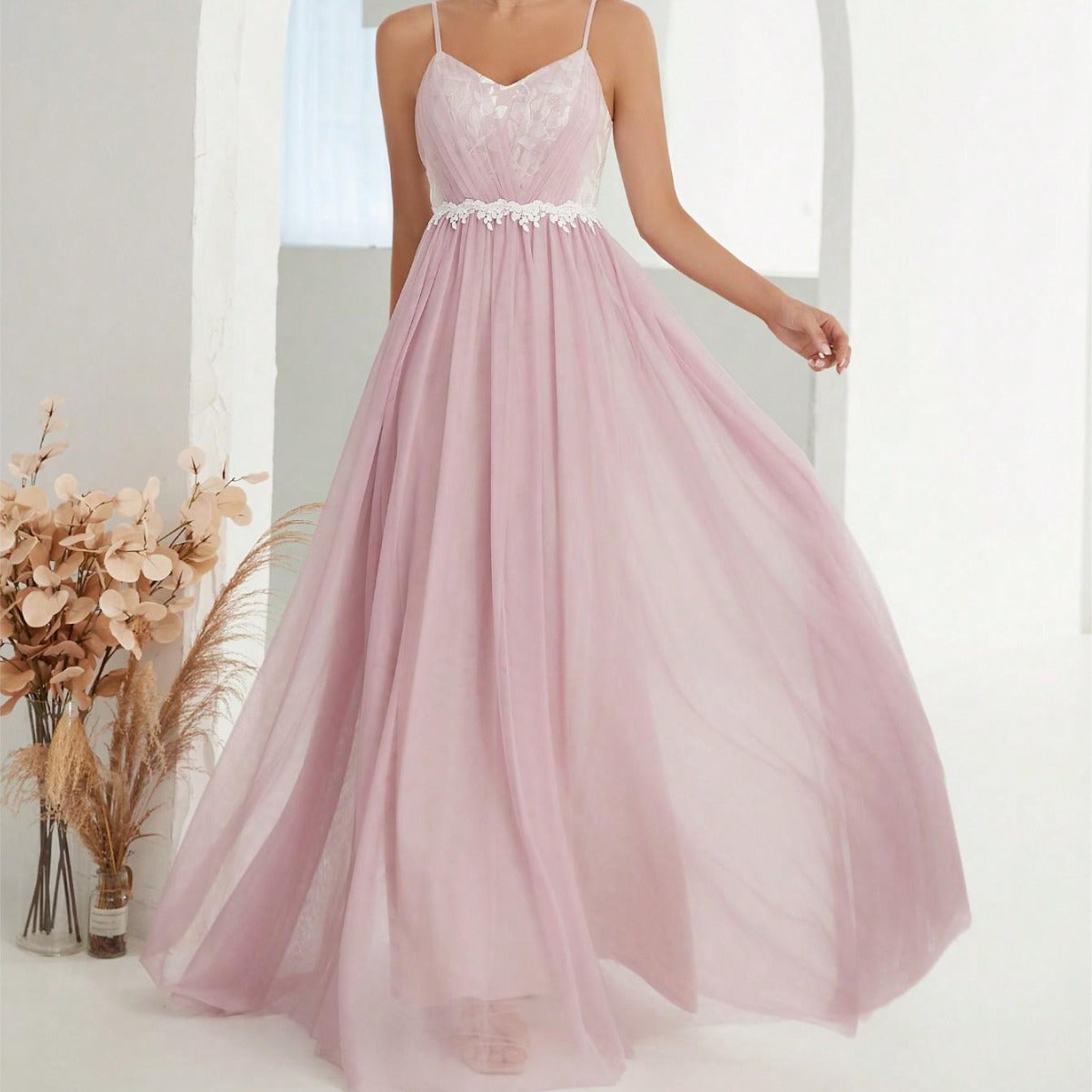 Women Suspender Evening Dress Mesh Cross Fold Lace Contrast Color Maxi Dress Summer