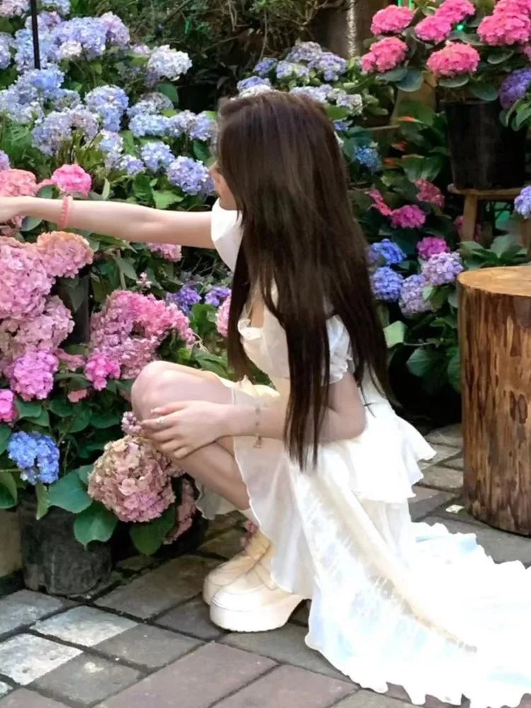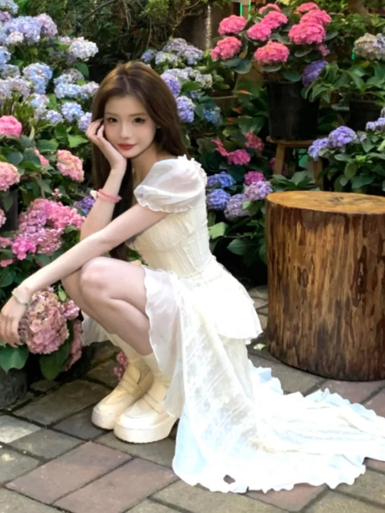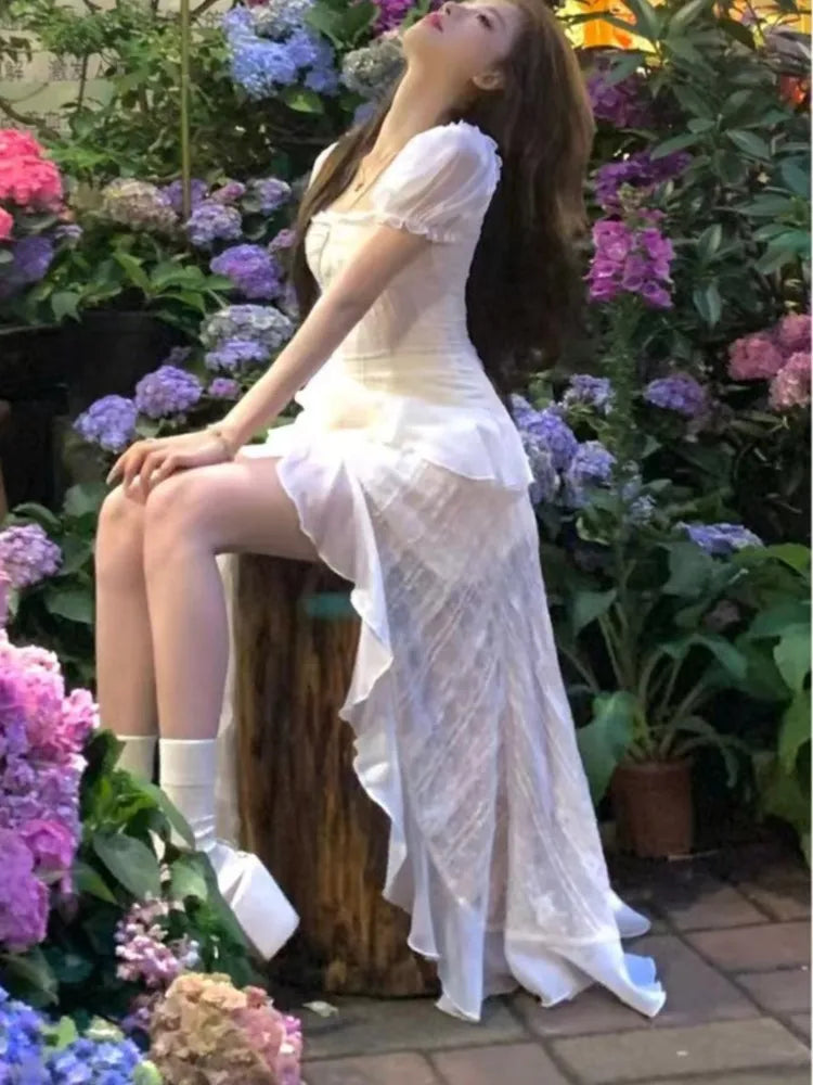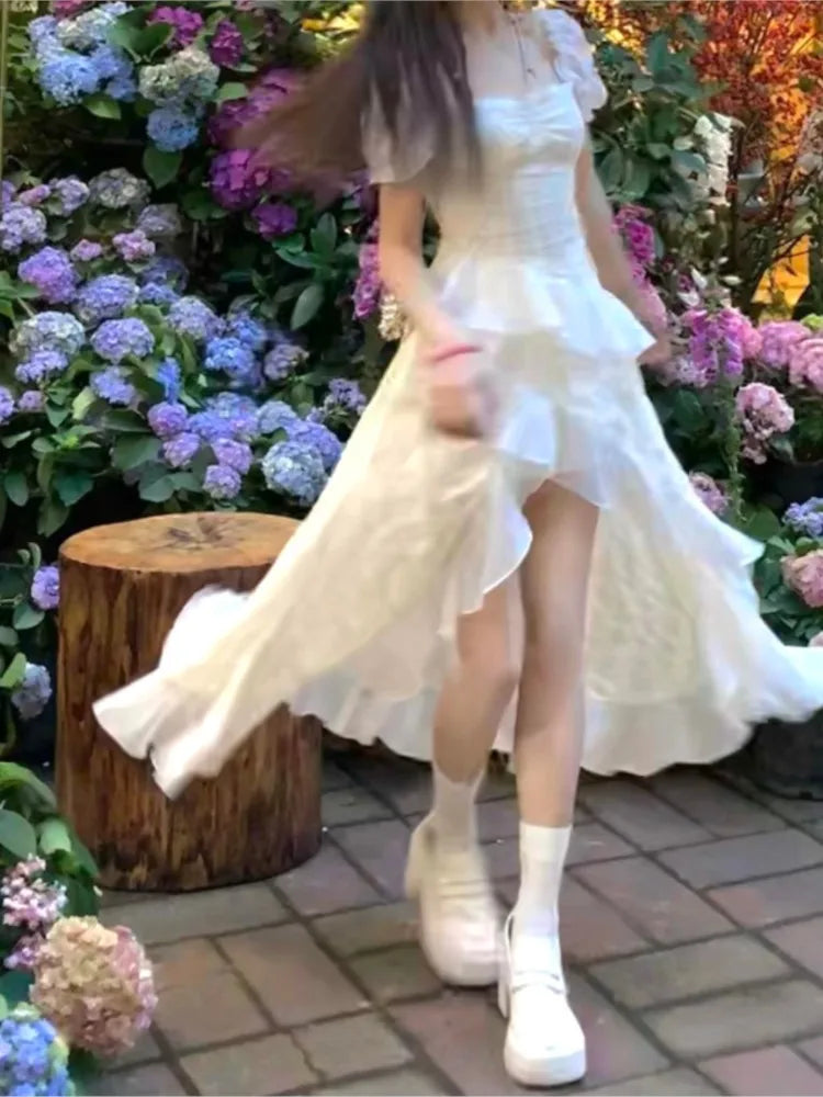 Y2K Irregular Ruffles Midi Dresses for Women Puff Sleeve Square Collar A-line French Vintage Birthday Party Dress Prom Vestidos